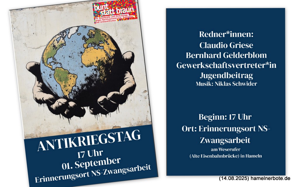 Am Montag ist "Antikriegstag" - die Infos zur Veranstaltung in Hameln um 17 Uhr am Mahnmal für die Zwangsarbeiter am Weserufer gibt es hier:
