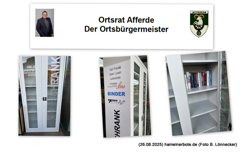 Den nachfolgenden Bericht über den neuen Bücherschrank in Afferde finden sie auch (kostenfrei) beim Boten. Die Pressemitteilung des Ortsbürgermeisters habe ich sehr gerne abgedruckt. Es ist das kleine aber durchaus arbeitsreiche Engagement vor Ort, das anerkennenswert ist.