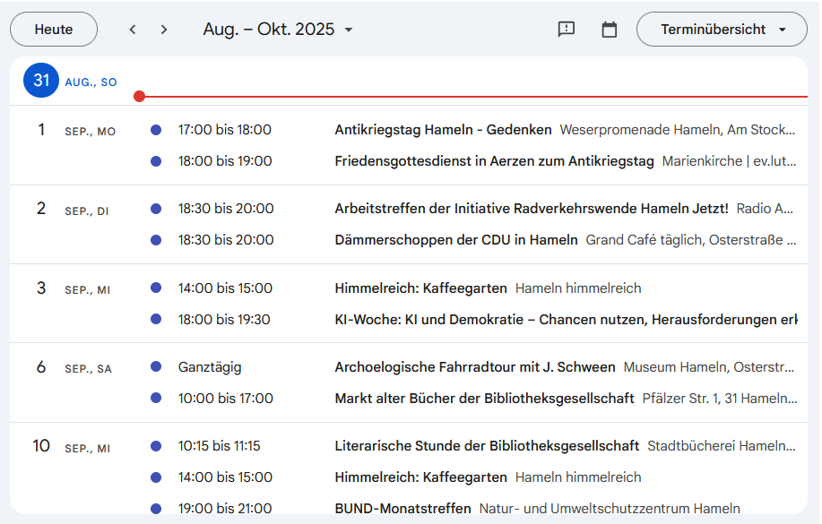Wie wichtig eine unabhängige und journalistisch kompetente Berichterstattung für eine Stadt sein kann, zeigte mir der Besuch des Umweltausschusses der Stadt Hameln am 21.08.. Ich habe mir die ersten zwei Stunden (Tagesordnungspunkte Lärmaktionsplan und Klimaschutzbericht - Sachstände) angehört und musste dann gehen. Berichte beim Boten finden sie dazu nicht. Hab es zeitlich (aber auch emotional) nicht geschafft. Für die DEWEZT war Herr Fisser vor Ort und m.E. hat er die Inhalte und Eindrücke in mehren Berichten sachlich und gut zusammengefasst.